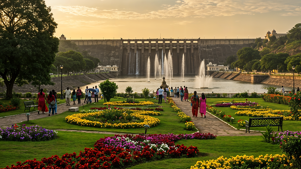 Krishnarajasagara (KRS) Dam in Mandya District, roughly 12 km from Mysore city.Its symmetrical layout features lush lawns, vibrant flower beds, topiary, and intricate waterways, culminating in the world-famous multihued musical fountain show held nightly. Commissioned in 1927 by Sir Mirza Ismail and designed by German botanist-landscape